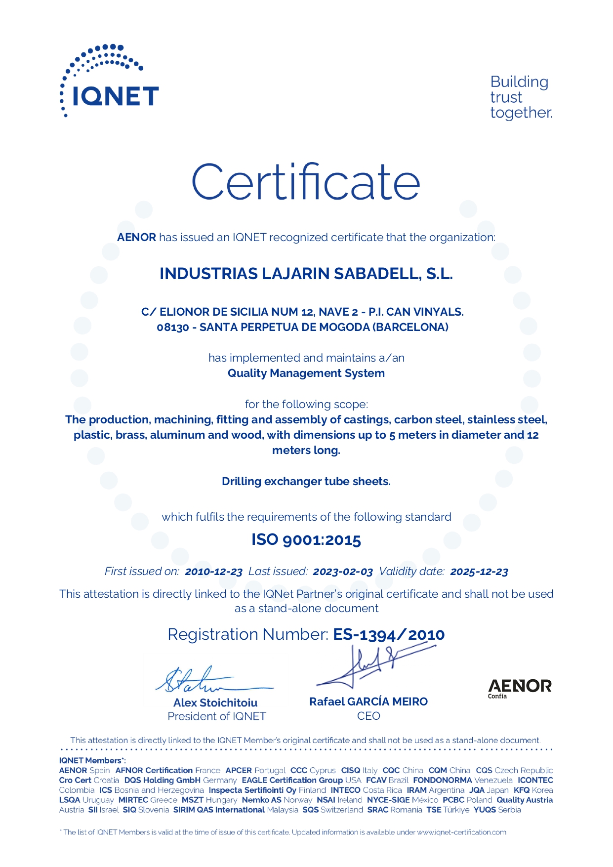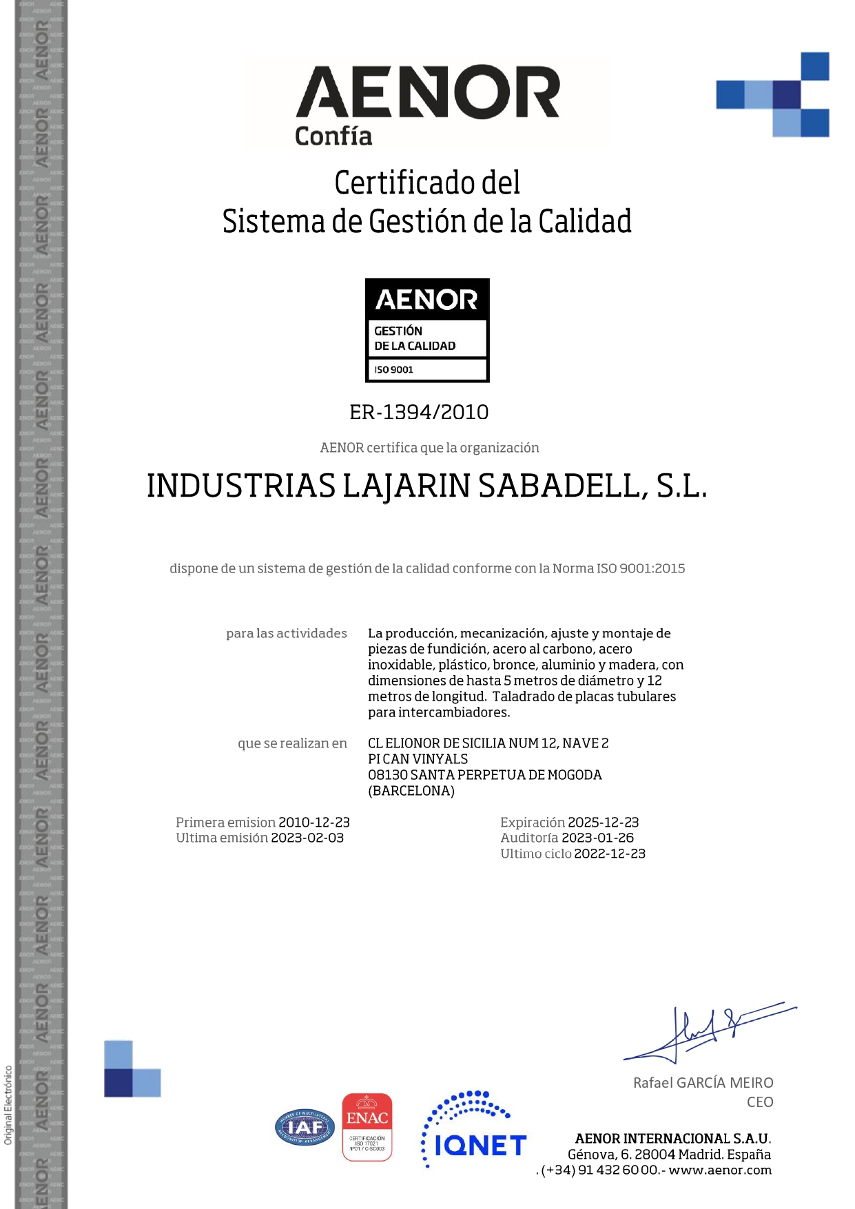 La obtención de la certificación de Calidad por AENOR bajo ISO-9001:2015 nos acredita para poder ofrecer al cliente la máxima respuesta en calidad y servicio.